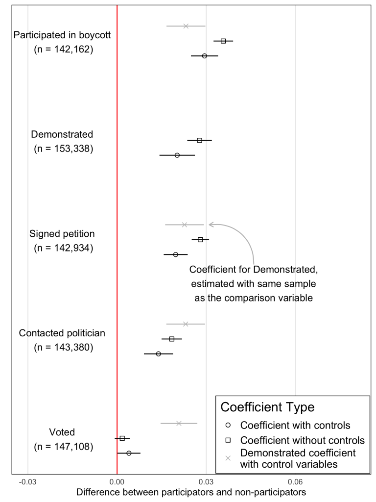 The graph below shows the associations between people's specific forms of participation experience and seeing their policy preferences realised. People politically active in protest and other kinds of nonelectoral political participation, such as demonstrations, petitions, and contacting officials, are more likely to have their policy preferences reflected in policy implementation within five years.