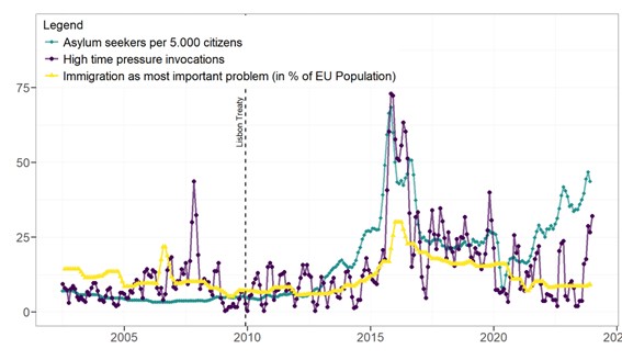 Do Commission leaders publicly push for speed on migration and asylum? There is a link between time-pressure language and changes in asylum numbers (problem pressure) and data capturing when citizens say migration is among the most important issues (public pressure). Before the Lisbon Treaty, we find no consistent link between pressures and urgent Commission communication. But after 2009, the relationship becomes strong and robust: when asylum numbers rise and when public salience rises, Commission leaders become more likely to invoke urgency.