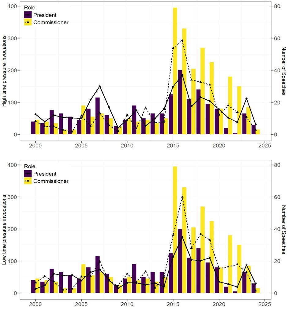 Commission Presidents are consistently more likely to invoke high time pressure. Historically, Commissioners have stressed low time pressure, but this gap has narrowed since the 2015–16 refugee crisis